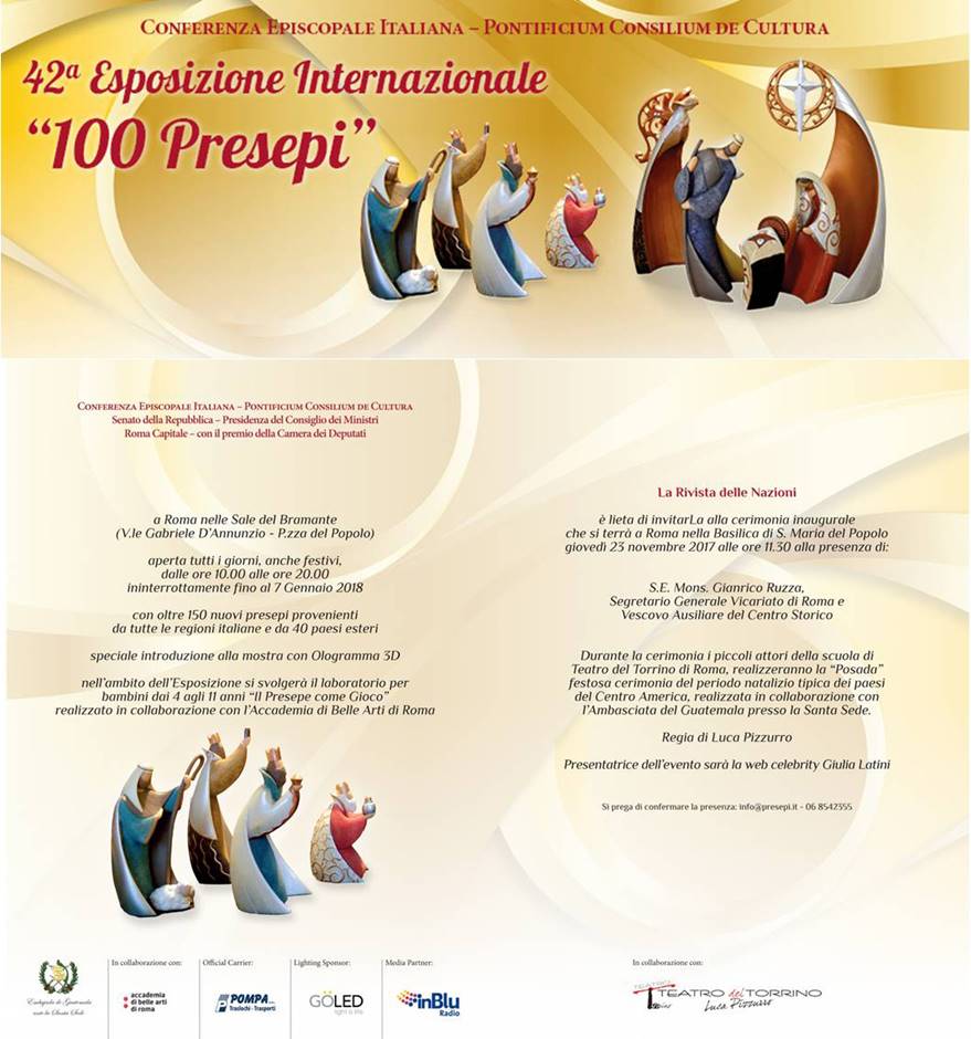 Il 23 novembre alle ore 11,30 avrà luogo l’inaugurazione dei “100 presepi”, l’Esposizione Internazionale che nelle Sale del Bramante in Piazza del Popolo accoglierà i visitatori dalle ore 10,00 alle 20,00 (interrottamente) dal 23 novembre c.a. al 7 gennaio 2018 anche nei giorni festivi, compresi 8 ,25,26 dicembre , 1 e 6 gennaio 2018.
