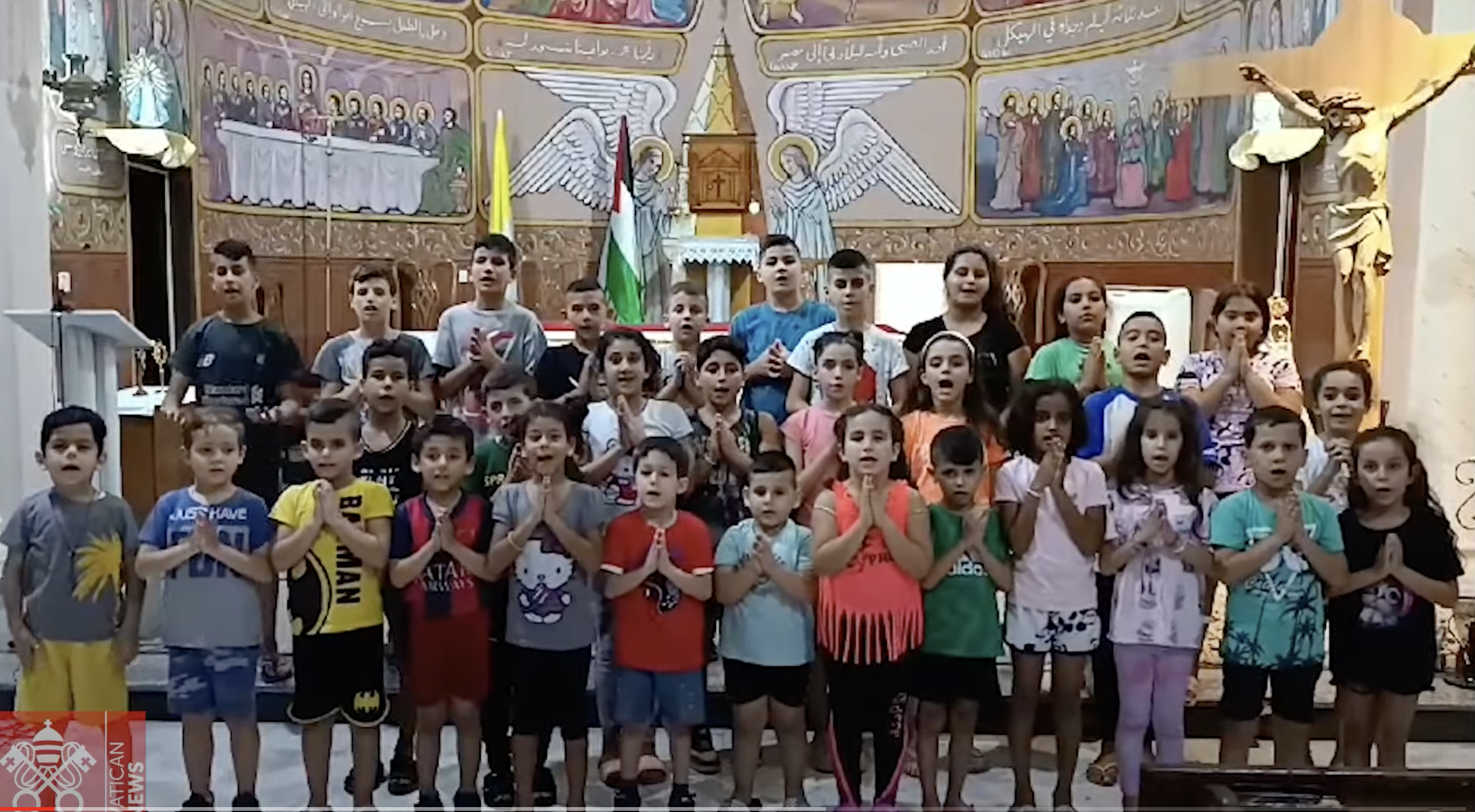 Una trentina di bambini della Parrocchia della Sacra Famiglia di Gaza recitano il Padre Nostro e l’Ave Maria affinché la guerra finisca.