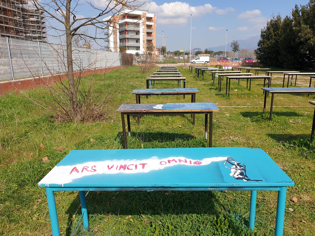 A Guidonia Montecello, cittadina a 21 km da Roma, presso l’Istituto superiore di Via Roma 298, che aggrega il polo liceale “E. Majorana” ed il polo tecnico “L. Pisano”, adoperando i banchi doppi non più utilizzabili e rimossi dalle aule, è stata realizzata un’installazione didattica effimera all’aperto.