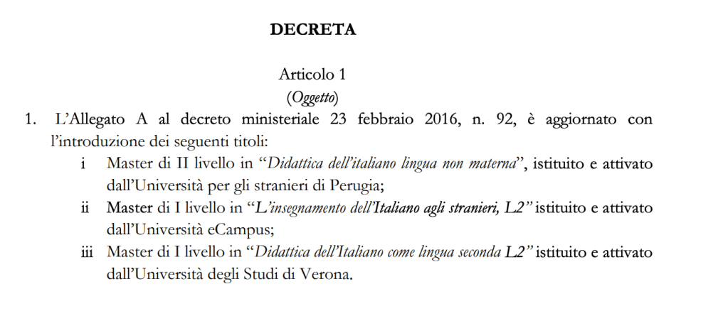 È corretto inserire il Master di I livello su L 2 per l’insegnamento dell’italiano agli stranieri, nel punto B.16 del TAB 3 delle GPS, in quanto il DM n.130 del 6 luglio 2023 aggiorna l’Allegato A al decreto ministeriale n.92 del 23 febbraio 2016.