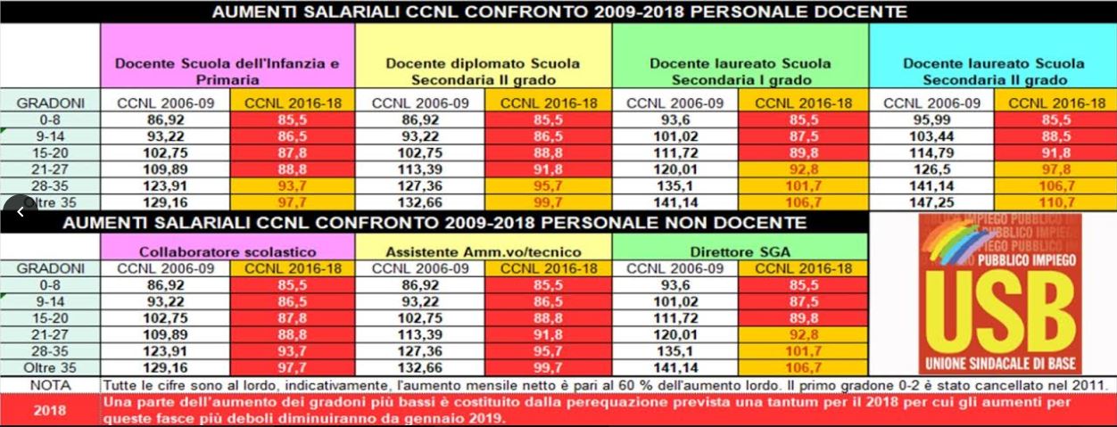 Secondo il sindacato di base “si tratta di somme ridicole. Basta fare un confronto con le cifre del 2009: un docente di scuola superiore dopo 14 anni di servizio arrivava a percepire 933,65 euro netti, oggi lo stesso lavoratore in busta paga si ritrova soli 461 euro (i 309,75 contrattati ai quali si sono aggiunti i 3 mesi di ritardo con cui ci sono stati erogati)”.