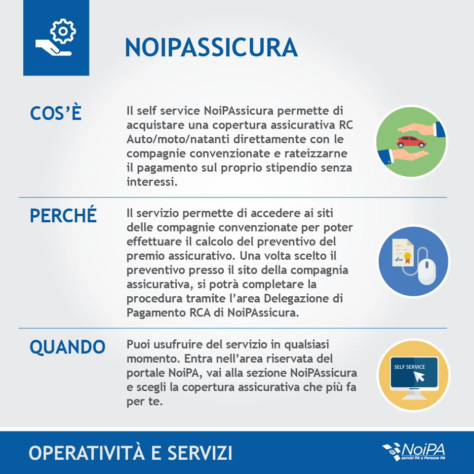 NoiPA mette a disposizione dei suoi amministrati il self service “NoiPAssicura”, che permette di acquistare una copertura assicurativa RC Auto/moto/natanti direttamente con le compagnie convenzionate e rateizzarne il pagamento sul proprio stipendio senza interessi.