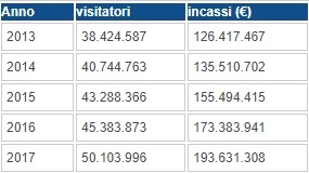 “Superata la soglia dei 50 milioni di visitatori e incassi che sfiorano i 200 milioni di euro, con un incremento sul 2016 di circa 5 milioni di visitatori e di 20 milioni di euro”.