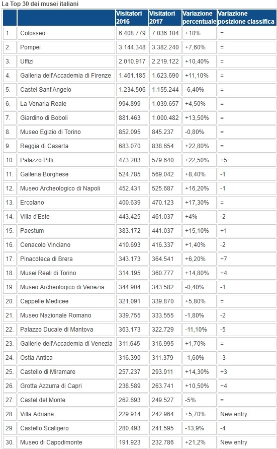 Sul podio delle regioni con il maggior numero di visitatori il Lazio (23.047.225), la Campania (8.782.715), la Toscana (7.042.018); i tassi di crescita dei visitatori più elevati sono stati registrati in Liguria (+26%), Puglia (+19,5%) e Friuli Venezia Giulia (15,4%). Nella Top 30 la crescita più sostenuta si registra con Palazzo Pitti (+23%) e quattro siti campani: la Reggia di Caserta (+23%), Ercolano (+17%), il Museo archeologico di Napoli (+16%) e Paestum (+15%). A seguire i Musei Reali di Torino (+15%) e il Castello di Miramare di Trieste (+14%). Significativa la crescita in classifica della Pinacoteca di Brera (+ 7 posizioni), di Palazzo Pitti (+ 5 posizioni) dei Musei Reali di Torino (+4 posizioni) e l’ingresso in classifica, per la prima volta, di Villa Adriana e del Museo di Capodimonte.