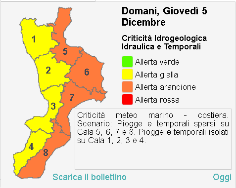 bollettino giornaliero di previsioni pubblicato sul sito della Protezione Civile Calabria alcune aree della Calabria risultano indicate con livello di allerta arancione per la giornata di giovedì 5 dicembre 2019.