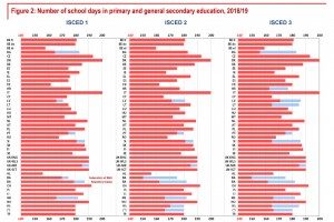 La Danimarca e l’Italia presentano il calendario più lungo (200 giorni), uniforme nei tre gradi di studio. Gli altri paesi hanno un calendario scolastico tra i 170-190 giorni.