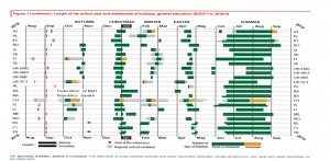 Le due tabelle evidenziano che in Italia le vacanze sono concentrate a Natale, Pasqua e in estate. In altri paesi i giorni di pausa sono distribuiti durante tutto l’anno (ottobre-maggio). Ad esempio in Francia, le vacanze estive durano 8 settimane, ma tra ottobre-novembre e a carnevale le scuole sono chiuse complessivamente per 4 settimane.