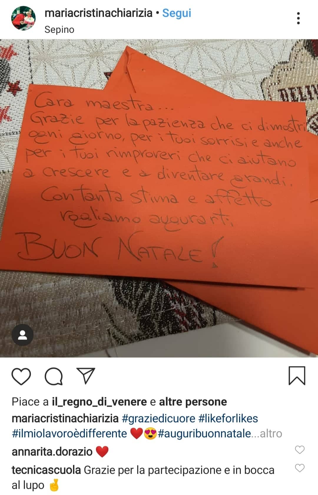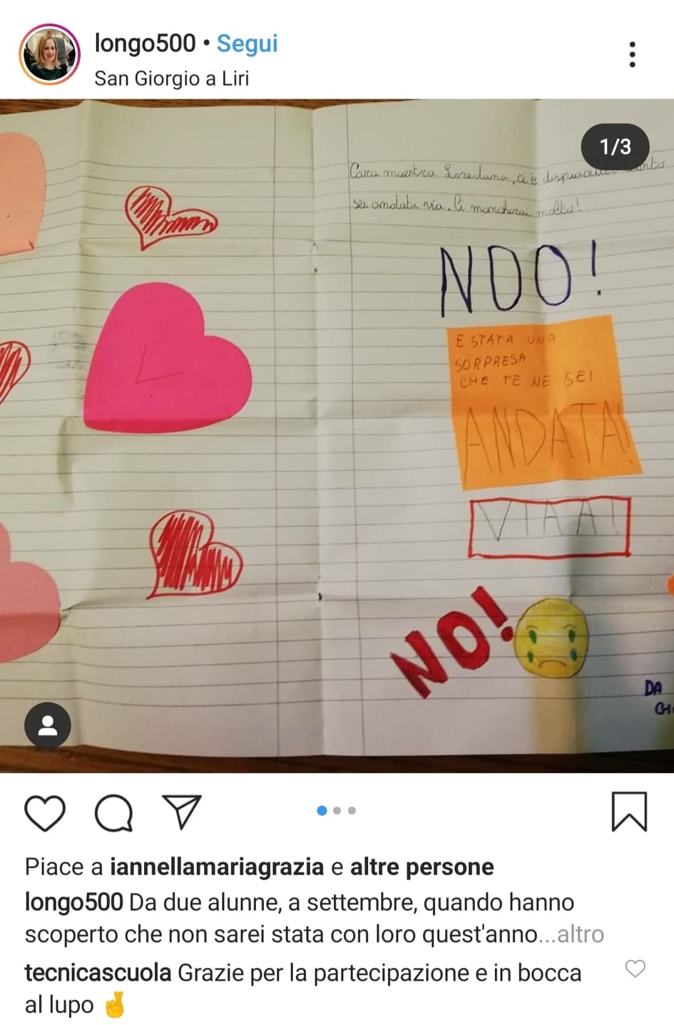 Si chiude “Cara maestra” il contest ideato e realizzato da Tecnica della Scuola su Instagram: la foto del bigliettino che ha ricevuto più like è stato quello del profilo luigina.bucci69 che ha ricevuto in totale 38 like.
