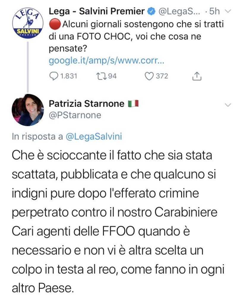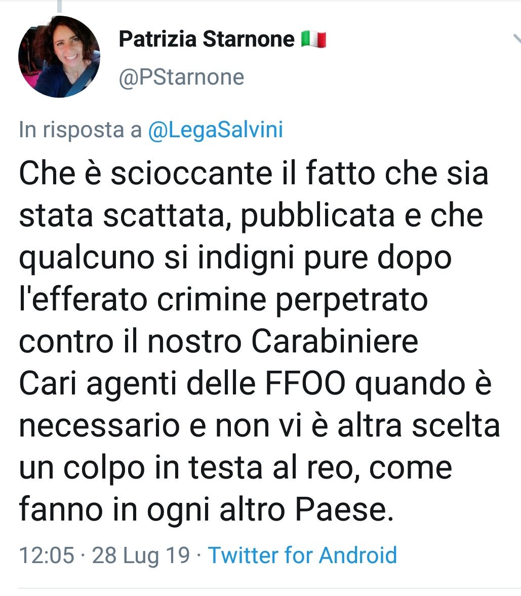 Si tratta del tweet postato sul proprio profilo da Patrizia Starnone, docente di diritto ed economia politica presso l’Istituto Pascal di Giaveno, indirizzo amministrazione finanza e marketing, già candidata della Lega alle scorse comunali.