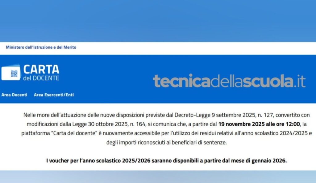 Questa la schermata esterna visibile da tutti. In breve, la piattaforma Carta del Docente è nuovamente accessibile dalle ore 12.00 del 19 novembre per l’utilizzo dei residui relativi all’anno scolastico 2024/25 e degli importi riconosciuti ai beneficiari di sentenze.