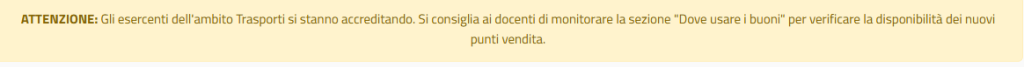 Cosa cambierà in merito ai trasporti? Nella piattaforma è comparso un nuovo avviso: “Gli esercenti dell’ambito Trasporti si stanno accreditando. Si consiglia ai docenti di monitorare la sezione ‘Dove usare i buoni’ per verificare la disponibilità dei nuovi punti vendita”.