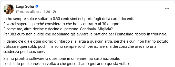 A denunciare la situazione sono gli stessi docenti. Luigi Sofia, insegnante precario e attivista, racconta di aver scoperto casualmente il problema confrontandosi con una collega. Solo dopo aver verificato personalmente ha constatato l’assenza dei fondi anche sulla propria carta.