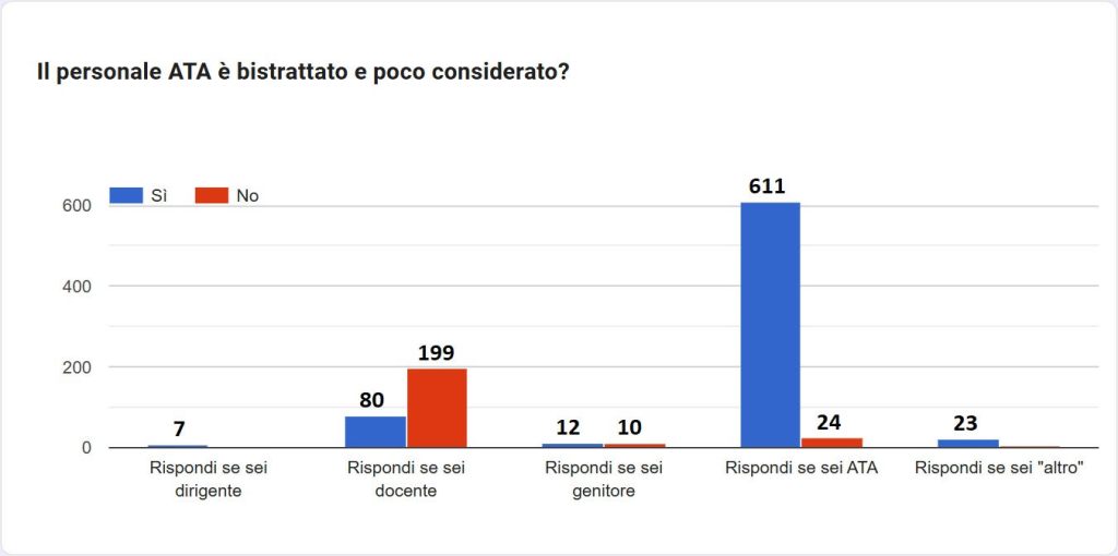 I dati sono molto interessanti e restituiscono una fotografia quasi impietosa della condizione del personale ATA: ben 611 su 639 collaboratori scolastici e assistenti amministrativi si sentono bistrattati e poco considerati.