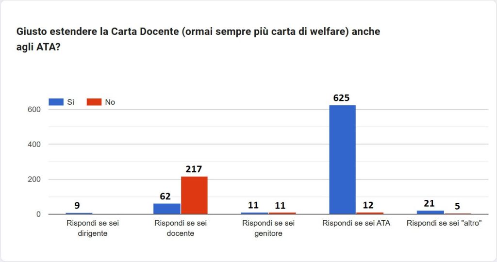 Particolare la risposta degli insegnanti, che forse temono ulteriori riduzioni del bonus, la cui cifra quest’anno è stata decurtata da 500 a 380 euro, in caso di ulteriore allargamento della platea dei beneficiari: 217 docenti su 282 (il 76,95%) non credono sia giusto estendere la Carta Docente agli ATA.