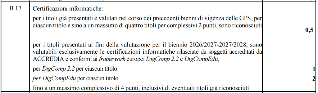 Per il biennio di aggiornamento delle GPS 2026/28 c’è la novità che le certificazioni informatiche verranno valutate solo se rilasciate da enti accreditati ad Accredia. Il punteggio complessivo dei titoli informatici passa dai 2 punti previsti nelle tabelle di valutazione del biennio 2024-2026 ai 4 punti delle tabelle allegate all’OM 27 del 16 febbraio 2026. I suddetti 4 punti sono un valore massimo e sono inclusivi di eventuali titoli già riconosciuti in passato.