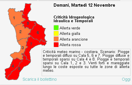 Sulla base dei modelli meteo di previsioni, il giornaliero bollettino diramato dalla Protezione Civile Calabria rileva nel territorio regionale scenari che prefigurano livelli di allertamento arancione e rosso, distribuiti nelle varie aree della Calabria per la giornata di martedì 12 novembre 2019.