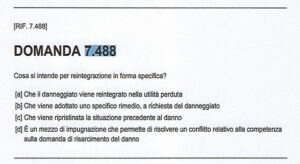 Ma anche la risposta alla domanda 7.488, fa osservare, non sarebbe corretta. Il quesito è il seguente: “Cosa si intende per reintegrazione in forma specifica?”. La risposta corretta, secondo il ministero dell’Istruzione, è la seguente: “Che il danneggiato viene reintegrato nella utilità perduta”.