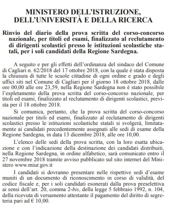 Dopo il rinvio, per le avverse condizioni meteo, lo scorso 18 ottobre, nella Gazzetta Ufficiale del 9 novembre, è stata pubblicata la data della prova scritta suppletiva per gli aspiranti dirigenti scolastici della Sardegna: la prova si terrà giovedì 13 dicembre a partire dalla 10.00. La prova avrà la durata di 150 minuti.