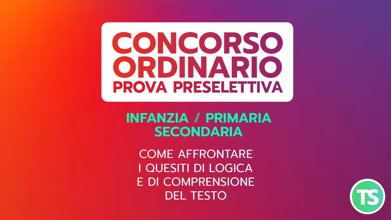 Per prepararti al concorso ordinario per tutti i gradi di scuola, segui il corso Come prepararti ai quesiti di logica e di comprensione del testo, in programma dal 12 aprile.