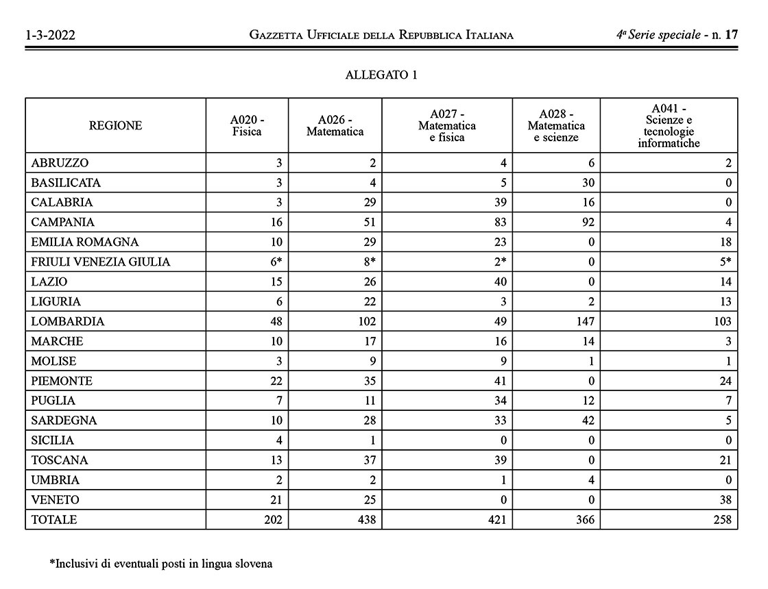 Con il bando pubblicato in Gazzetta Ufficiale il giorno 1 marzo 2022 sono stati riaperti i termini di partecipazione alle procedure concorsuali relative alle classi di concorso A020 – Fisica, A026 – Matematica, A027 – Matematica e Fisica, A028 – Matematica e Scienze, A041 – Scienze e tecnologie informatiche, cioè delle cosiddette materie STEM.