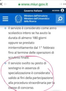 Nella scheda, i tecnici del Ministero scrivono che per accedere al concorso è valido il servizio sul sostegno.