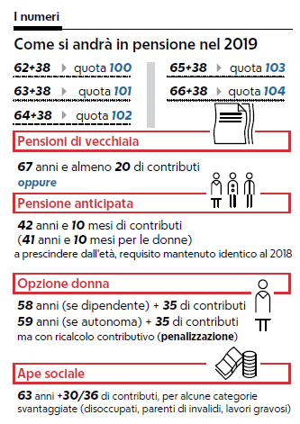 Per chi avrà 62 anni di età e 38 di contributi nel 2019 l’uscita scatterà solo da aprile prossimo, con cadenze trimestrali per i successivi via libera dal lavoro: un’operazione che dovrebbe favorire l’uscita anticipata (anche fino a 5 anni) di circa 400 mila persone nate tra il ‘54 e il ‘57, con il vincolo, però, del divieto di cumulo.