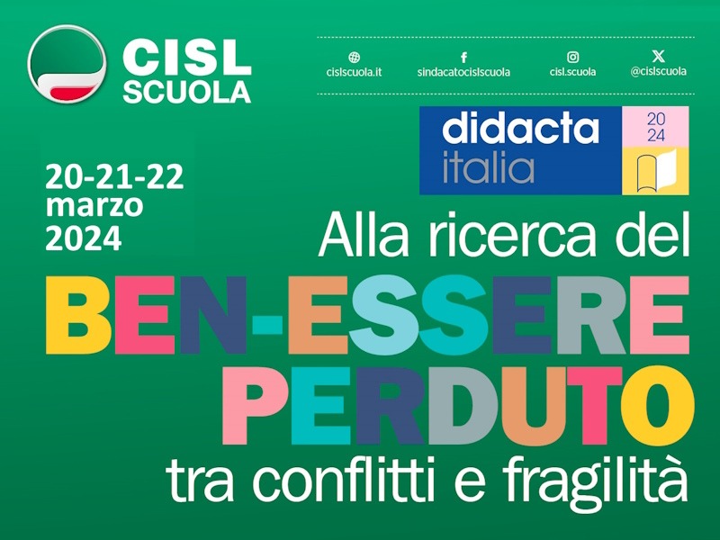 La CISL Scuola partecipa alla “tre giorni” con un proprio stand (W21, al piano attico del Padiglione Spadolini) e propone una nutrita serie di iniziative; esperti e protagonisti di una didattica innovativa si confronteranno e offriranno testimonianze su come realizzare nei contesti scolastici un clima di ben-essere che contribuisce in modo rilevante alla qualità e al buon esito dei percorsi educativi.