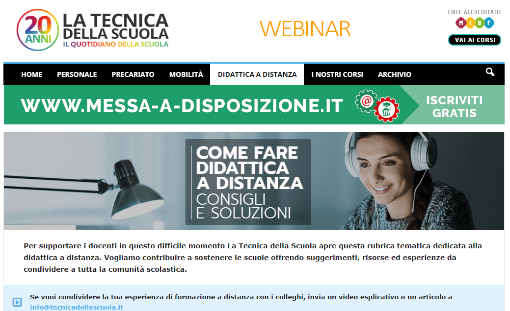 Il momento storico è difficile e la Tecnica della Scuola ha raddoppiato i suoi sforzi per offrire oltre alla normale informazione sul sito internet www.tecnicadellascuola.it, anche una rubrica tematica dedicata alla didattica a distanza.