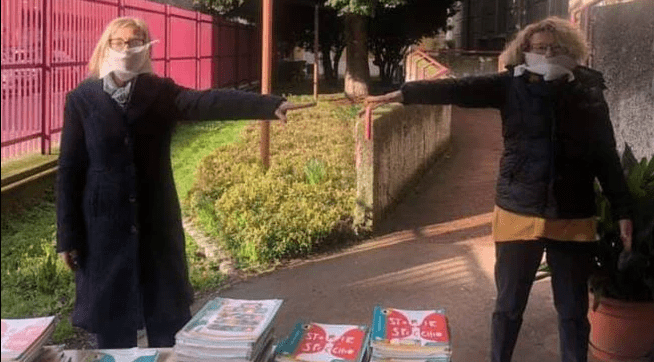 “Nonostante tutti corsi di aggiornamento, eccoci a fare la cosa più semplice: distribuire i libri con le attività da eseguire, ahimè a casa, in questo periodo di sospensione. Insieme alla mia collega, siamo rigorosamente a un metro di distanza, oltre alle mascherine indossate per il tour porta a porta“, continua la docente.