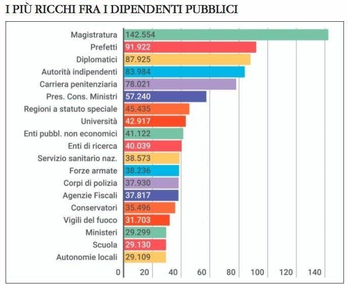 STIPENDI – Nella classifica degli stipendi della Pa a percepire gli stipendi più alti sono i magistrati (142.554 euro all’anno). Ultimi i dipendenti sottopagati della scuola, assieme a quelli delle autonomie locali (29.130 all’anno).