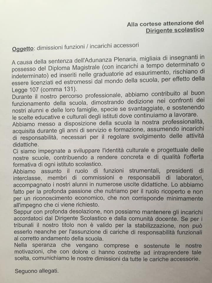 La mobilitazione dei diplomati magistrale all’indomani della sentenza dell’Adunanza Plenaria del Consiglio di Stato, prosegue su più fronti. Adesso, arrivano le dimissioni dagli incarichi accessori da parte di quei docenti che lavorano con diploma magistrale.
