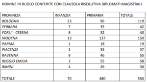 Dal monitoraggio si vede come in totale sono 550 i diplomati magistrali assunti in ruolo con riserva. Solo nella provincia di Modena 159, mentre in quella di Bologna 119.
