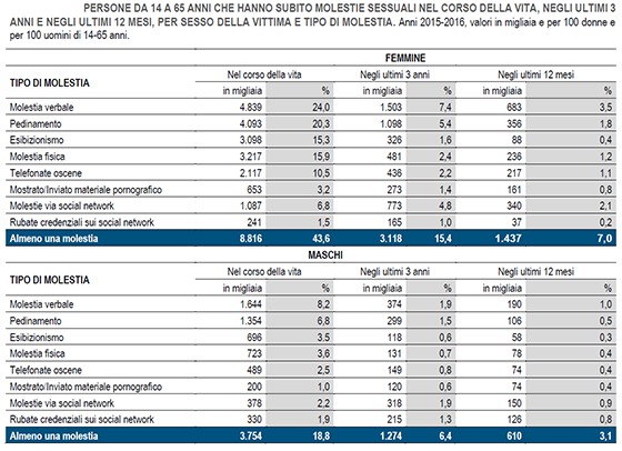 Questi alcuni dati che emergono dal rapporto dell’Istat: “Le molestie e i ricatti sessuali sul lavoro” nel 2015-2016, diffuso oggi.