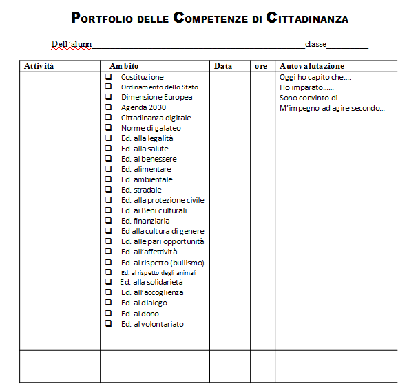 La logica del portfolio delle competenze che è stata avviata e applicata per alcuni anni nella scuola, (Riforma Moratti – Prof. Bertagna) consente di documentare e diventare memoria delle attività proposte, delle esperienze realizzate che contribuiscono e formare, rinsaldare, consolidare le competenze civiche nell’ottica della formazione del cittadino attivo e responsabile.