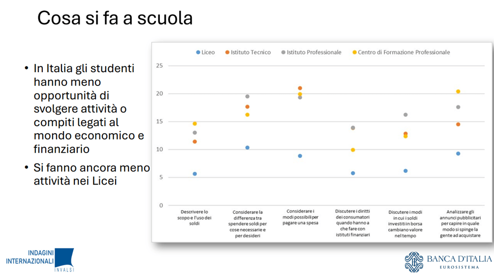 Gli studenti italiani dichiarano di aver imparato a scuola meno della metà dei termini finanziari proposti nel contesto dell’indagine, un termine in meno rispetto alla media OCSE. Le attività legate al mondo economico-finanziario sono svolte meno frequentemente rispetto ai coetanei di altri paesi, con differenze significative tra le diverse aree geografiche e tipologie di scuola.
