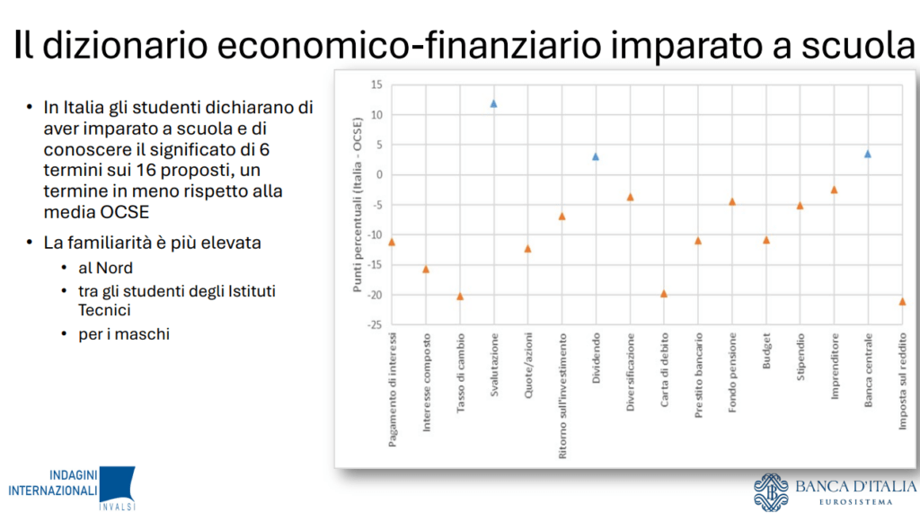 In Italia, il termine più conosciuto è “stipendio”, quello meno conosciuto “interesse composto”. Gli studenti del Nord Ovest e del Nord Est hanno maggiore familiarità con concetti di tipo finanziario; gli studenti degli Istituti Tecnici conoscono in media circa un termine in più rispetto agli altri.