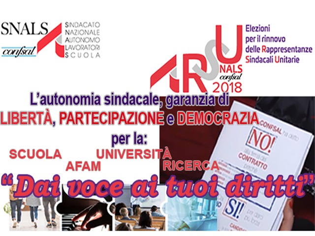 Il nostro è un invito al personale dell’Istruzione e della Ricerca ad appoggiare la lista dello SNALS-CONFSAL, voto che avrebbe anche il significato di voler premiare il coraggio di un sindacato autonomo che non teme di essere escluso dalla rappresentanza territoriale pur di salvaguardare innanzitutto i diritti di tutti i lavoratori della Scuola, dell’Afam, dell’Università e della Ricerca.