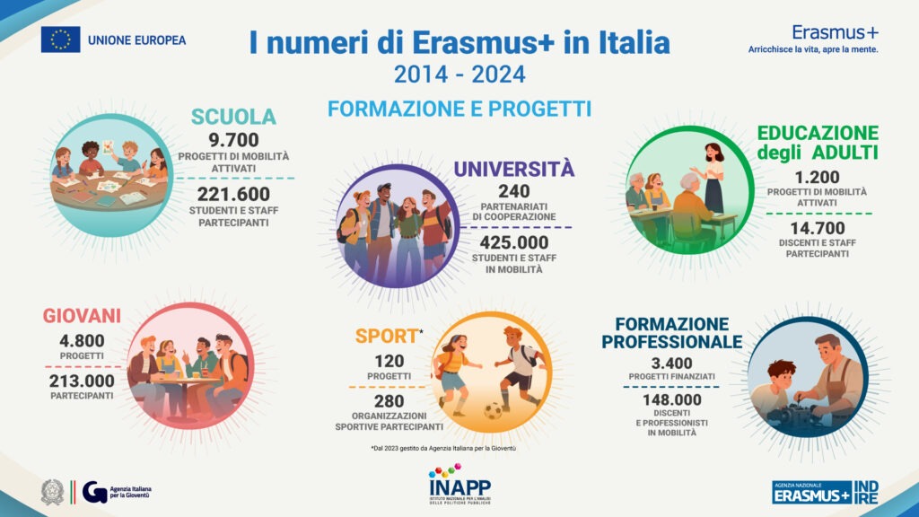Nel 2025 la borsa Erasmus+ varia da 350 a 400 euro al mese per la mobilità per studio, fino a 550 euro per i tirocini, con rimborsi aggiuntivi per i viaggi sostenibili. Crescono anche i progetti di cooperazione, 20 quelli finanziati quest’anno.