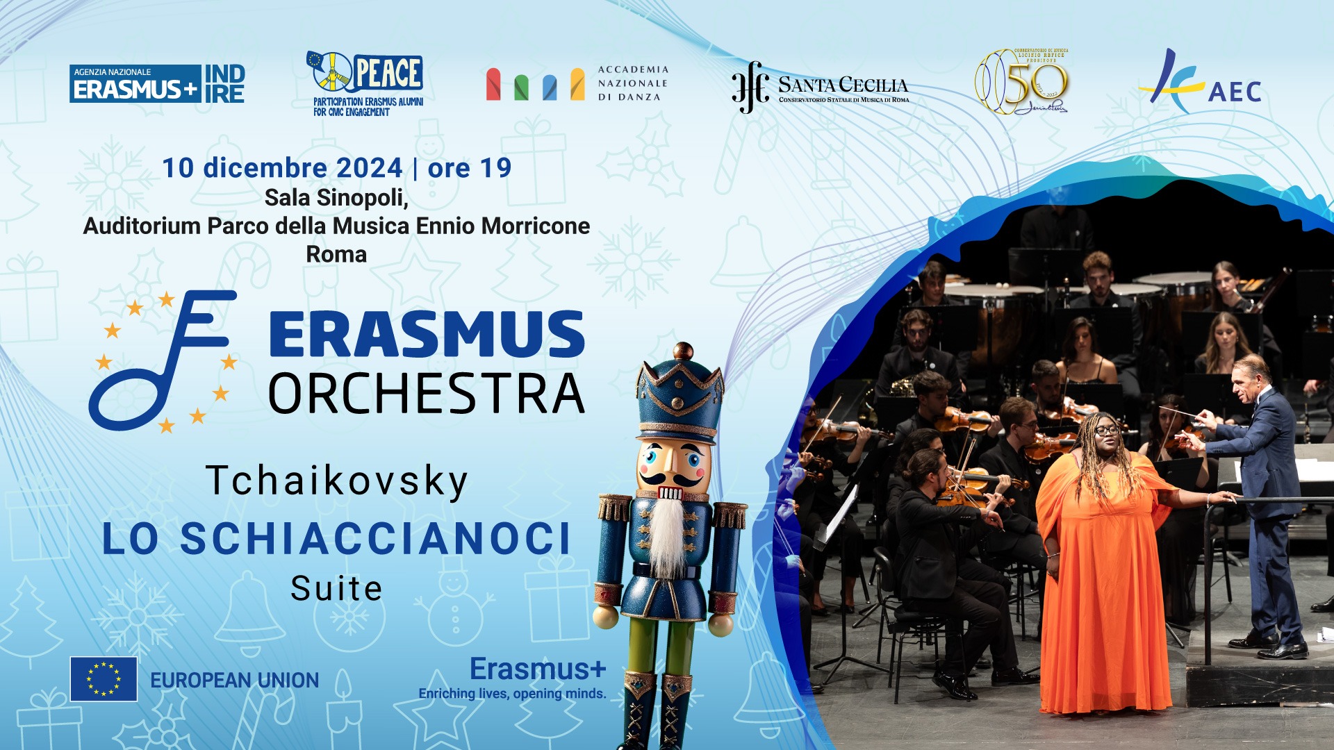 Il 10 dicembre 2024, alle ore 19:00, la Sala Sinopoli dell’Auditorium Parco della Musica di Roma ospiterà il concerto natalizio dell’Erasmus Orchestra, un evento dedicato ai valori della cittadinanza europea. Protagonisti della serata saranno oltre 50 giovani musicisti provenienti da più di 20 conservatori europei, diretti dal Maestro Elio Orciuolo.