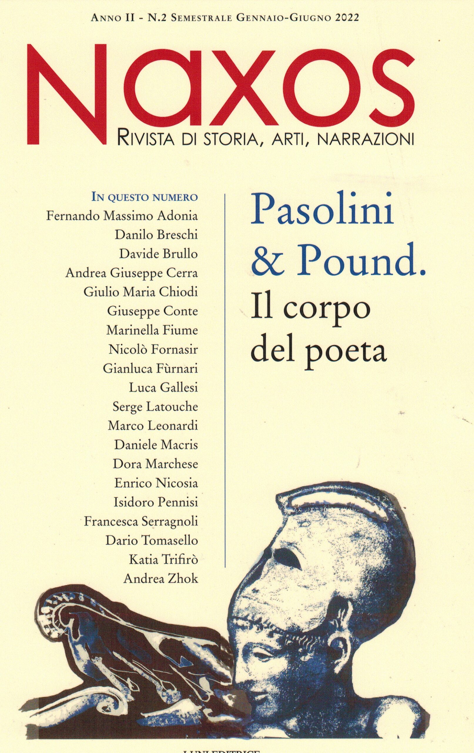 Esce per Luni Editore il secondo numero della “Rivista di storia, arti, narrazioni: Naxos” diretta da Fernando Massimo Adonia e curata dalla direttrice artistica del “Festival Naxoslegge”, Fulvia Toscano, instancabile divulgatrice di cultura e di manifestazioni ad essa collegate. Dotata pure di un nutrito e sapiente Comitato scientifico, questo secondo numero della Rivista “Naxos” ha come titolo: “Pasolini e Pound. Il corpo del poeta”, scelto in concomitanza col centenario della nascita del grande intellettuale italiano, nonché scrittore, regista e sceneggiatore, ucciso in circostanze misteriose, e del Cinquantesimo della morte a Venezia di Ezra Pound, poeta, saggista e traduttore statunitense.