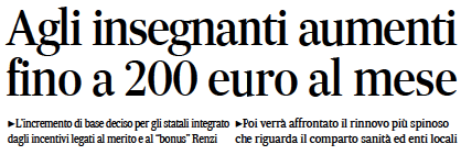 In particolare si punta a destinare al rinnovo contrattuale le somme finora destinate per il bonus merito (200 milioni) e quello dell’aggiornamento professionale, i 500 euro da spendere per l’aggiornamento professionale (altri 380 milioni). Spostarli sul contratto nazionale i due strumenti cambierebbe in maniera radicale i termini del rinnovo.