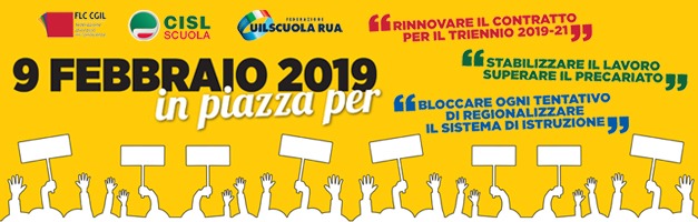 Sabato 9 Febbraio 2019 a Roma, i sindacati della Flc Cgil, Cisl Scuola e Uil Scuola, scenderanno in piazza contro le politiche del Governo M5S-LEGA. Il concentramento dei manifestanti è previsto in Piazza della Repubblica alle ore 9.00, dove partirà il corteo che raggiungerà Piazza San Giovanni in Laterano per il comizio conclusivo dei segretari generali di Cgil, Cisl e Uil, Maurizio Landini, Annamaria Furlan e Carmelo Barbagallo.