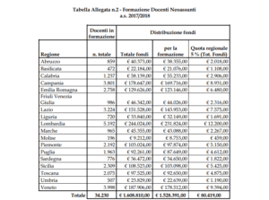 Anche in questo caso, come nella circostanza riportata dei docenti di ruolo, la ripartizione dei fondi viene effettuata in proporzione al numero dei docenti neoassunti, nell’anno scolastico 2017-2018, in servizio in ogni regione.