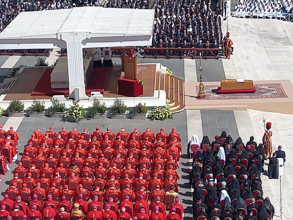 I fedeli sono arrivati e rimangono in silenzio. Il loro attaccamento per il Papa che ci ha lasciati non ha bisogno di parole. Sono arrivati anche i Capi di Stato. Iniziano le esequie in una giornata bellissima, in cui il sole splende e batte forte sui presenti in Piazza San Pietro a Roma.