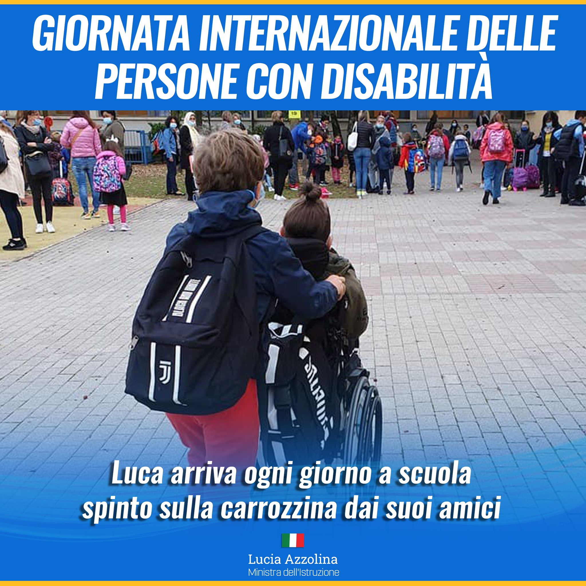 In occasione della Giornata internazionale delle persone con disabilità, la Ministra dell’Istruzione Lucia Azzolina è intervenuta sui social per condividere una storia di inclusione e di amicizia che viene dal mondo della scuola: la storia di Luca, un bambino di Malnate (Varese) affetto da tetraparesi spastica, che frequenta la classe quinta della scuola primaria Battisti, a circa centro metri da casa.