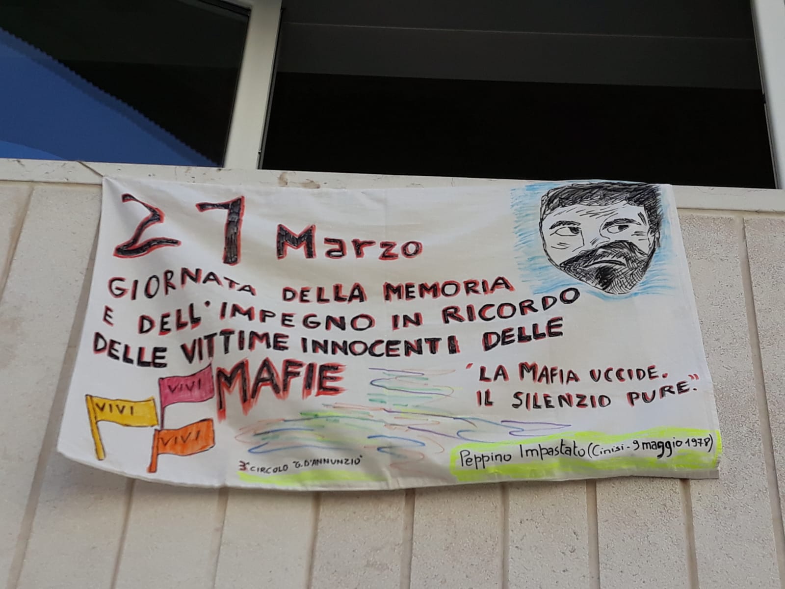 Le alunne e gli alunni del 3° Circolo “G.D’Annunzio” di Trani (BT) seguendo le iniziative promosse dall’associazione Libera, hanno esposto uno striscione che riporta le parole di una delle vittime di mafia, Peppino Impastato, perché se è certo che la Mafia uccide, anche il Silenzio è suo complice.