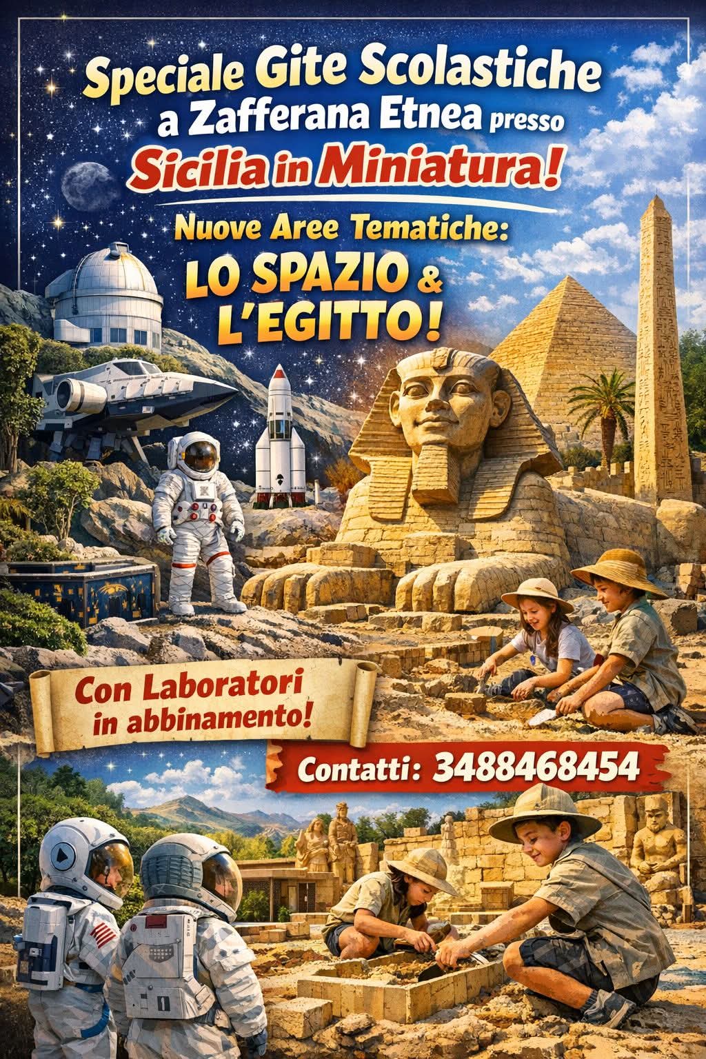 Le nuove aree tematiche dedicate allo Spazio e all’Antico Egitto permettono ai ragazzi di viaggiare tra pianeti, astronauti, piramidi e faraoni, stimolando curiosità e apprendimento in modo divertente.