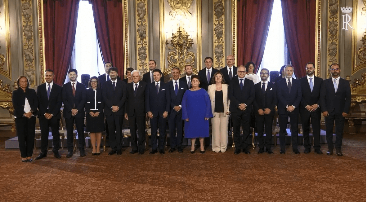 Giuseppe Conte e i suoi ministri hanno giurato al Quirinale nelle mani del Presidente della Repubblica Sergio Mattarella leggendo la formula di rito e firmando nel Salone delle Feste del Quirinale.