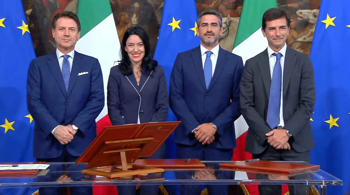 Anna Ascani (seconda da sinistra) con Giuseppe Conte e Riccardo Fraccaro, Roberto Chieppa