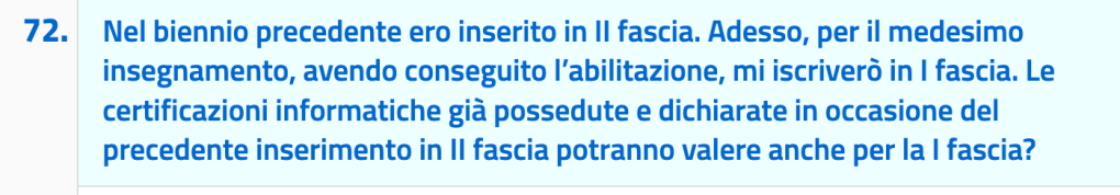 In un primo tempo era apparso di capire che il Ministero dell’Istruzione e del Merito non volesse convalidare le certificazioni informatiche per coloro che le avevano già dichiarate nel biennio precedente per la seconda fascia e adesso, avendo conseguito l’abilitazione, chiedono di entrare in prima fascia per il medesimo o i medesimi insegnamenti. Adesso con la FAQ 72 arriva il chiarimento che anche coloro che cambiano fascia di appartenenza e avevano già dichiarato le certificazioni informatiche rilasciate da enti non accredidati “ACCREDIA”, potranno vedersi riconosciute automaticamente le suddette certificazioni fino ad un massimo di 2 punti. Inoltre questi aspiranti potranno inserire anche un altro titolo informatico, per esempio il DIGICOMP.EDU che darà ulteriori 2 punti per arrivare ad un massimo di 4 punti.